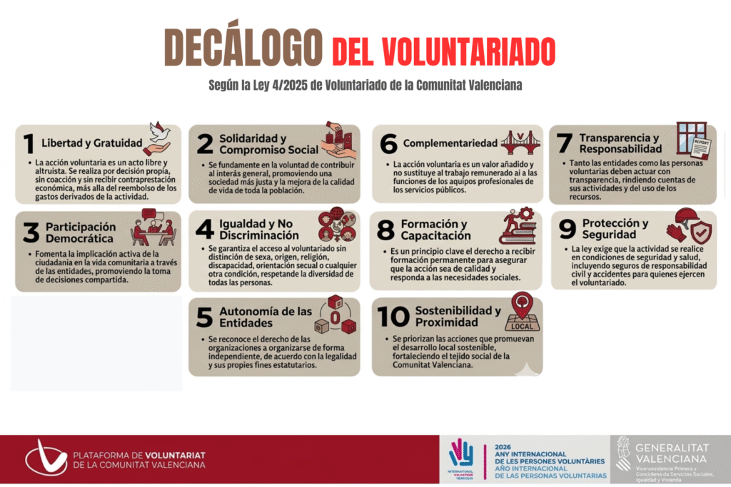 Para contar con una herramienta de protección y sensibilización, la PVCV ha lanzado el Decálogo del Voluntariado basado en la actual Ley 4/2025.